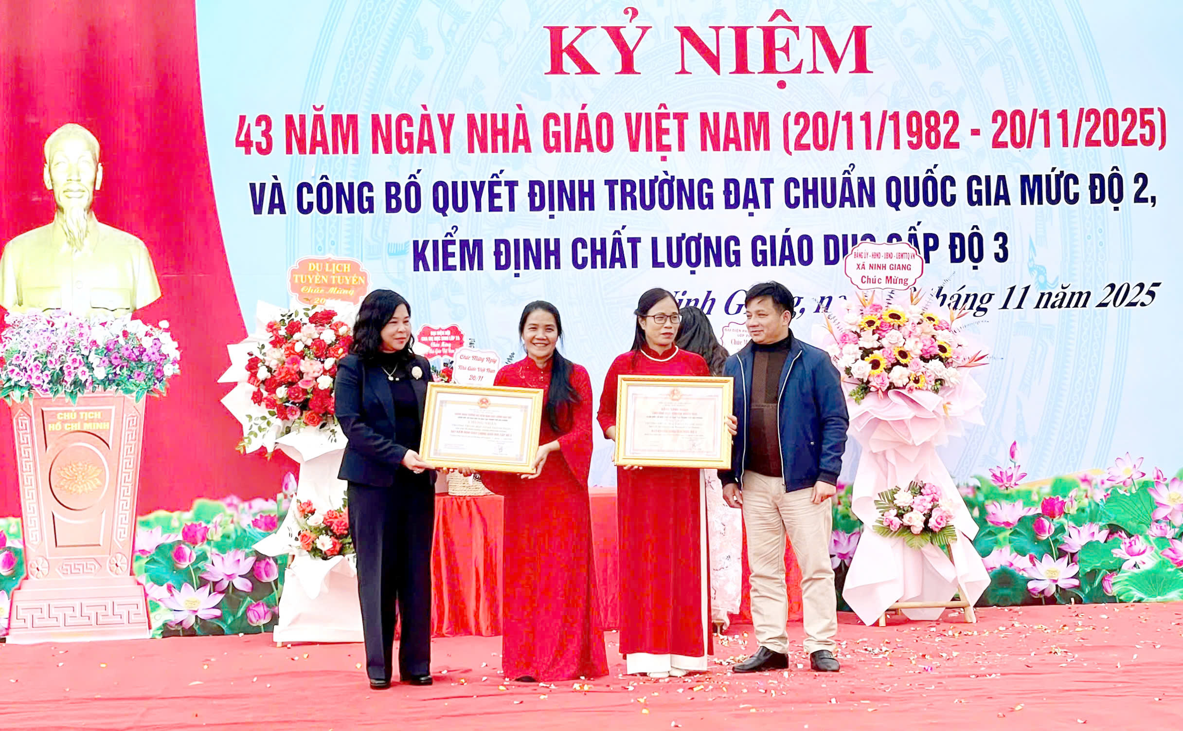 Đồng chí Nguyễn Thị Huê, Phó bí thư Đảng ủy, Chủ tịch UBND xã  trao bằng công nhận trường đạt chuẩn quốc gia mức độ 2